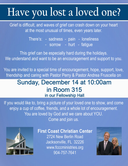 You are invited to a special time of encouragement, hope, support, love, friendship and caring with Pastor Perry & Pastor Andrea Fruscella on Sunday, December 14 at 10am in Room 315 in the Fellowship Hall.