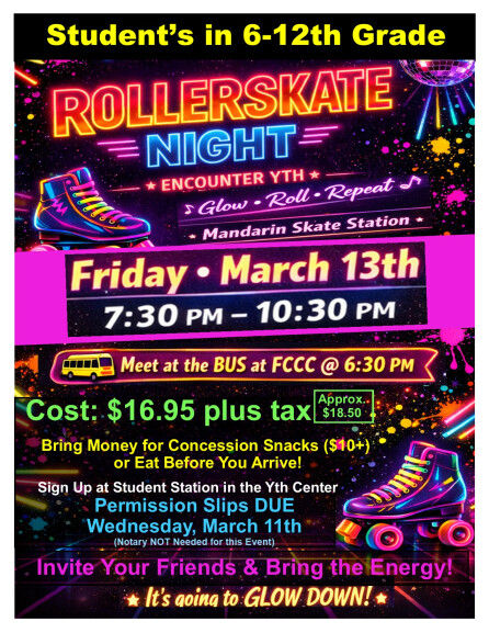 We will meet at the BUS in the FCCC parking lot at 6:30pm and go to Mandarin Skate Station.
